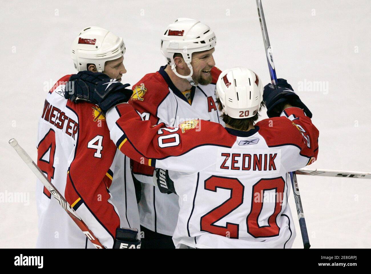 Florida Panthers Bryan Mccabe C Is Congratulated By Teammates Jay Bouwmeester 4 And Richard Zednik After Scoring Against The Washington Capitals During The First Period Of Their Nhl Hockey Game In Washington